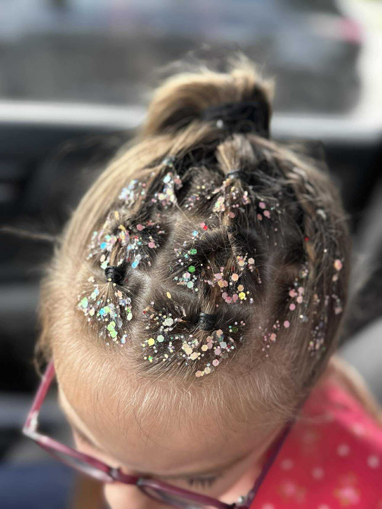 Make every day a good hair day with our made-in-house hair glitter! You and yours littles will love this glitter. Goes on smooth and adds so much fun to your day. Safe to use on hair and skin. Made with long-lasting, alcohol free hair gel & multicolored glitter. Washes out of hair easily.