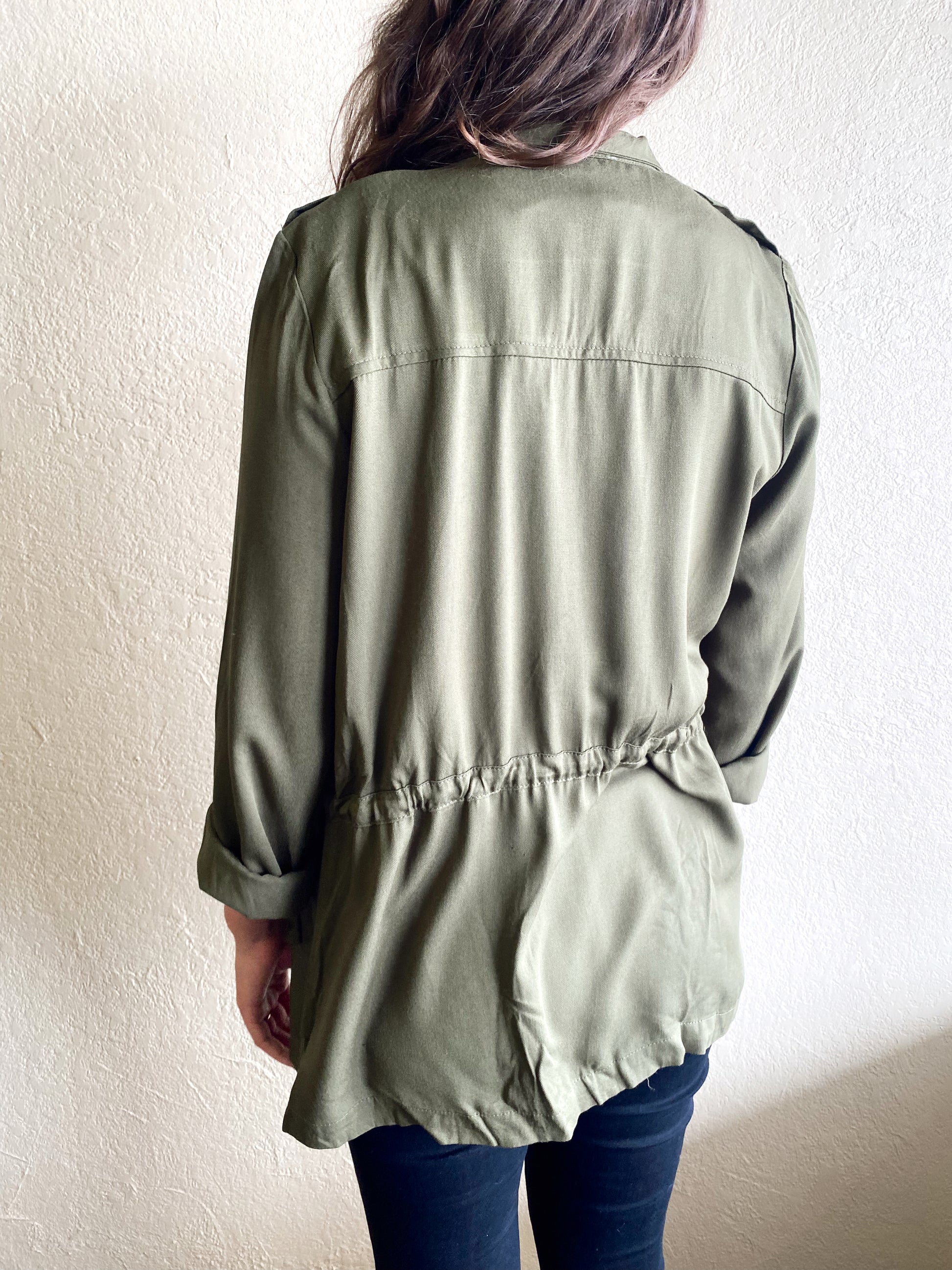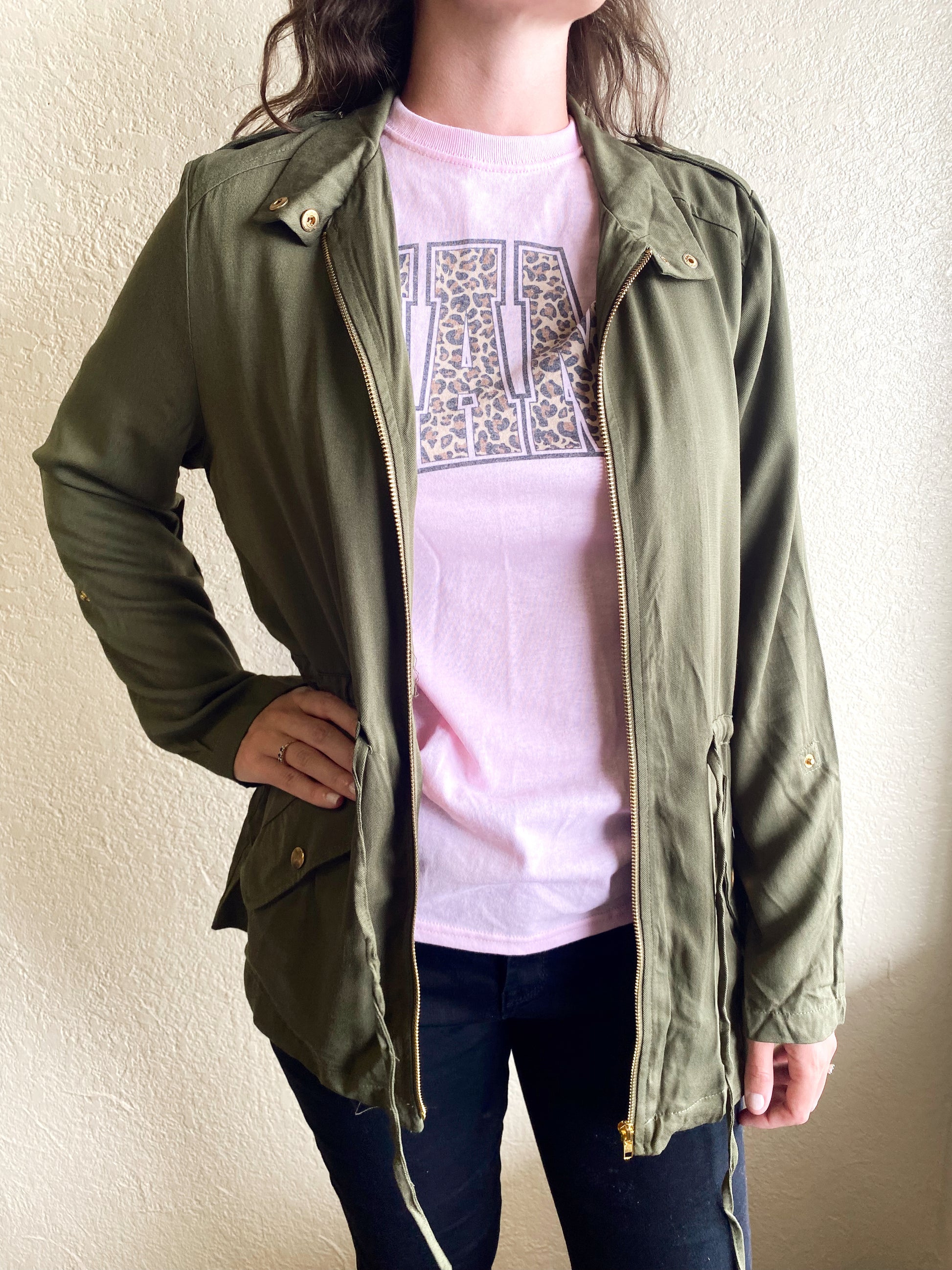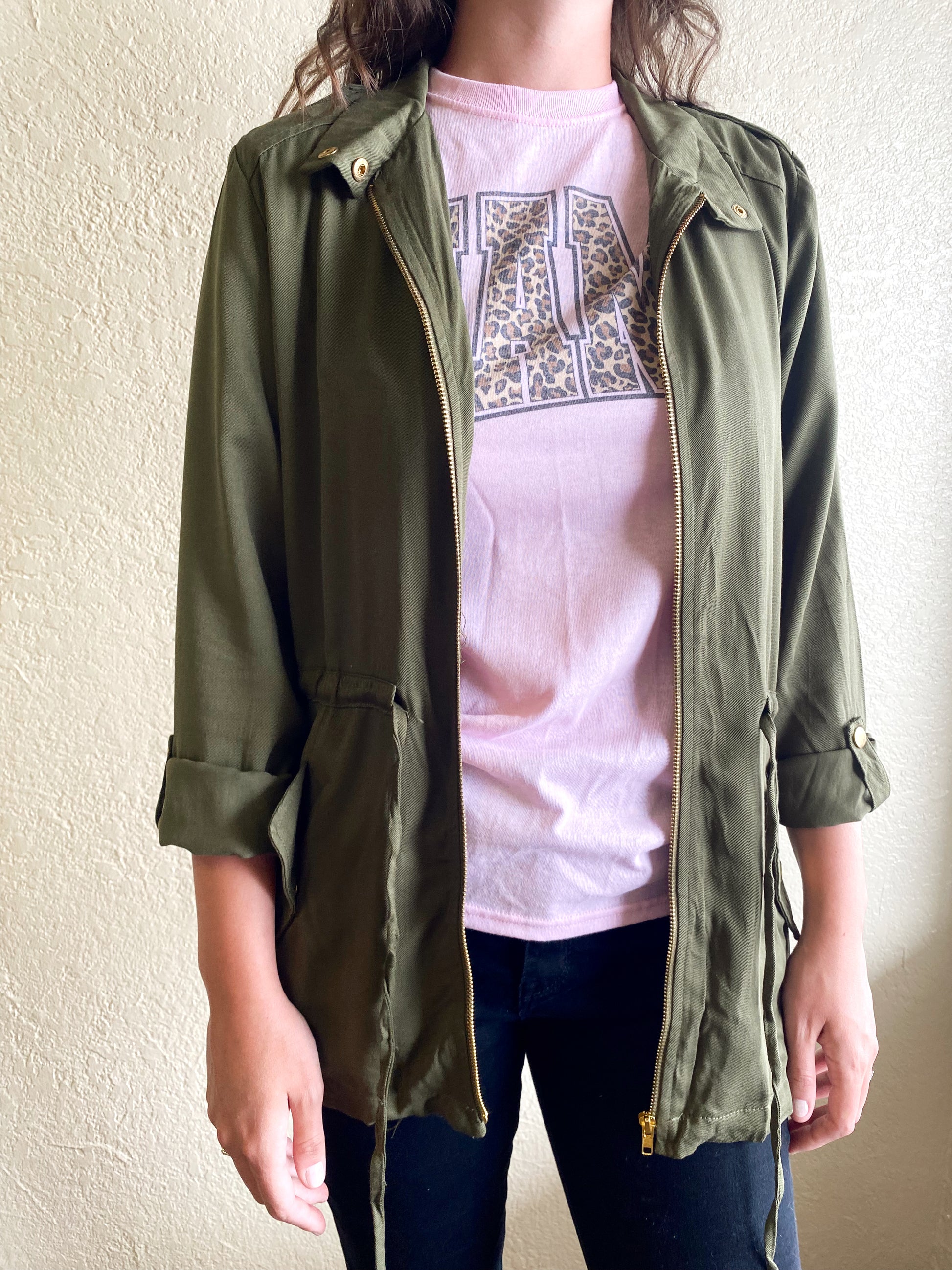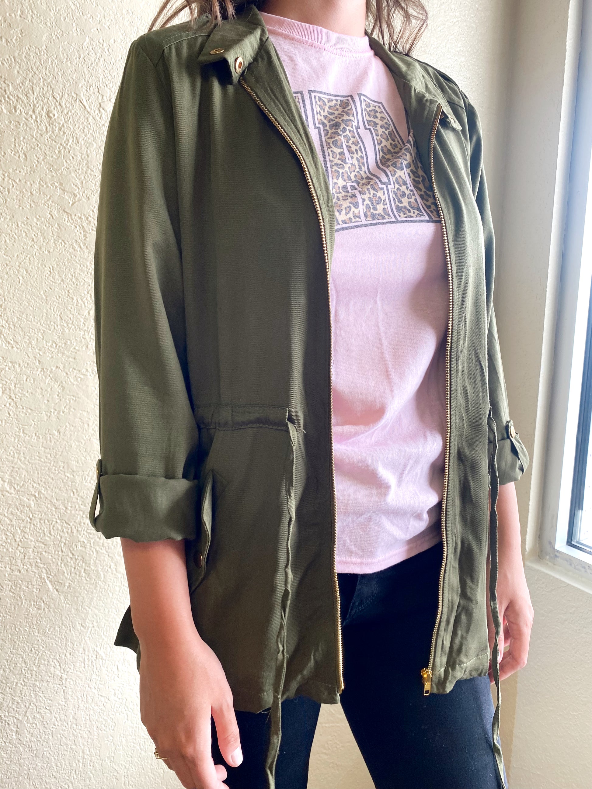Conquer any adventure with our Lead the Way Jacket. This lightweight olive green jacket features striking gold accents and an adjustable cinched waist for a flattering fit. Sleeves roll and can be fastened with a button.
