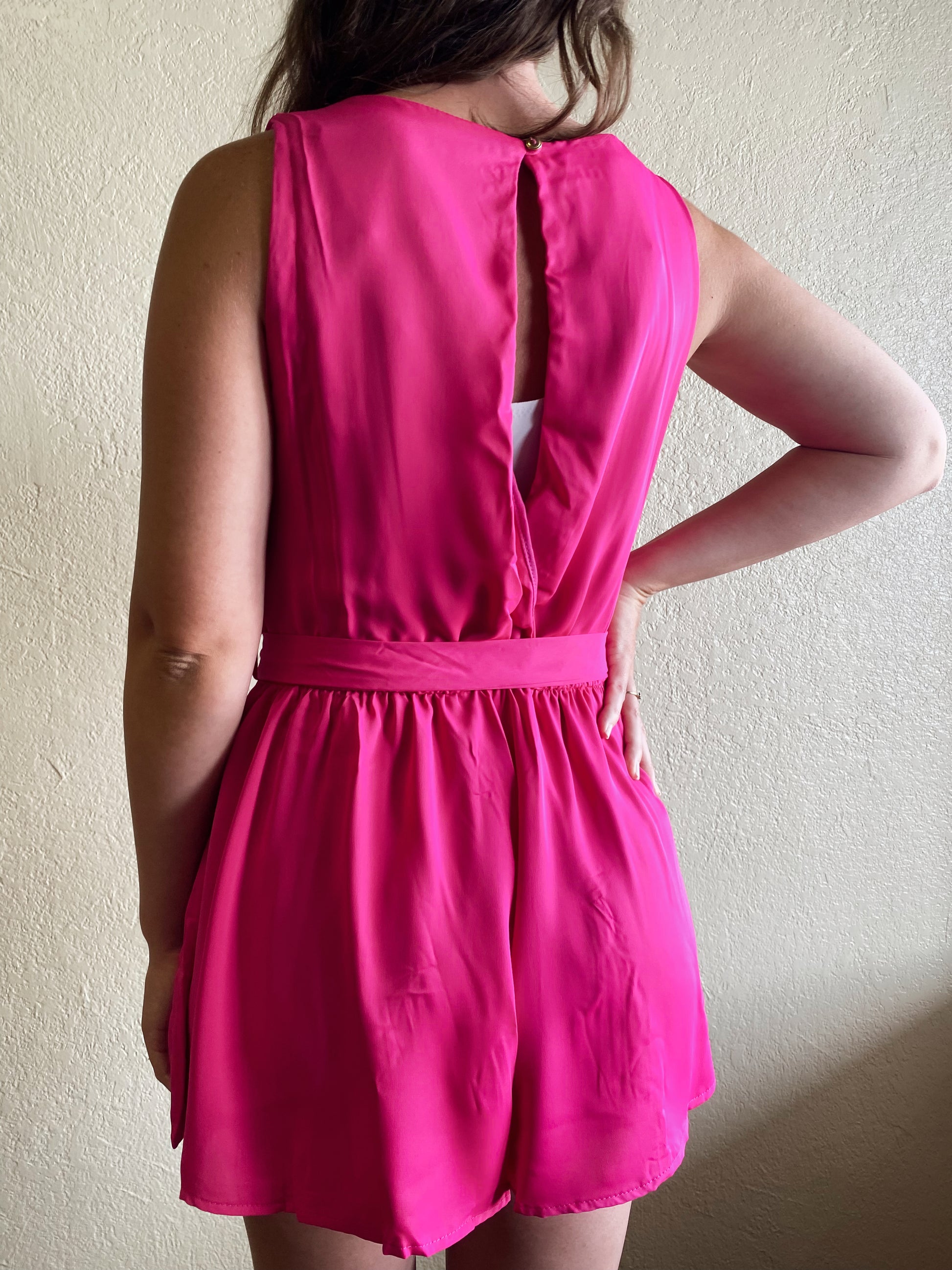 This hot pink romper features a slight open back with a tie waist and is sleeveless, perfect for any summer day. Made from high-quality material, this romper is both comfortable and stylish, making it a must-have in your wardrobe.