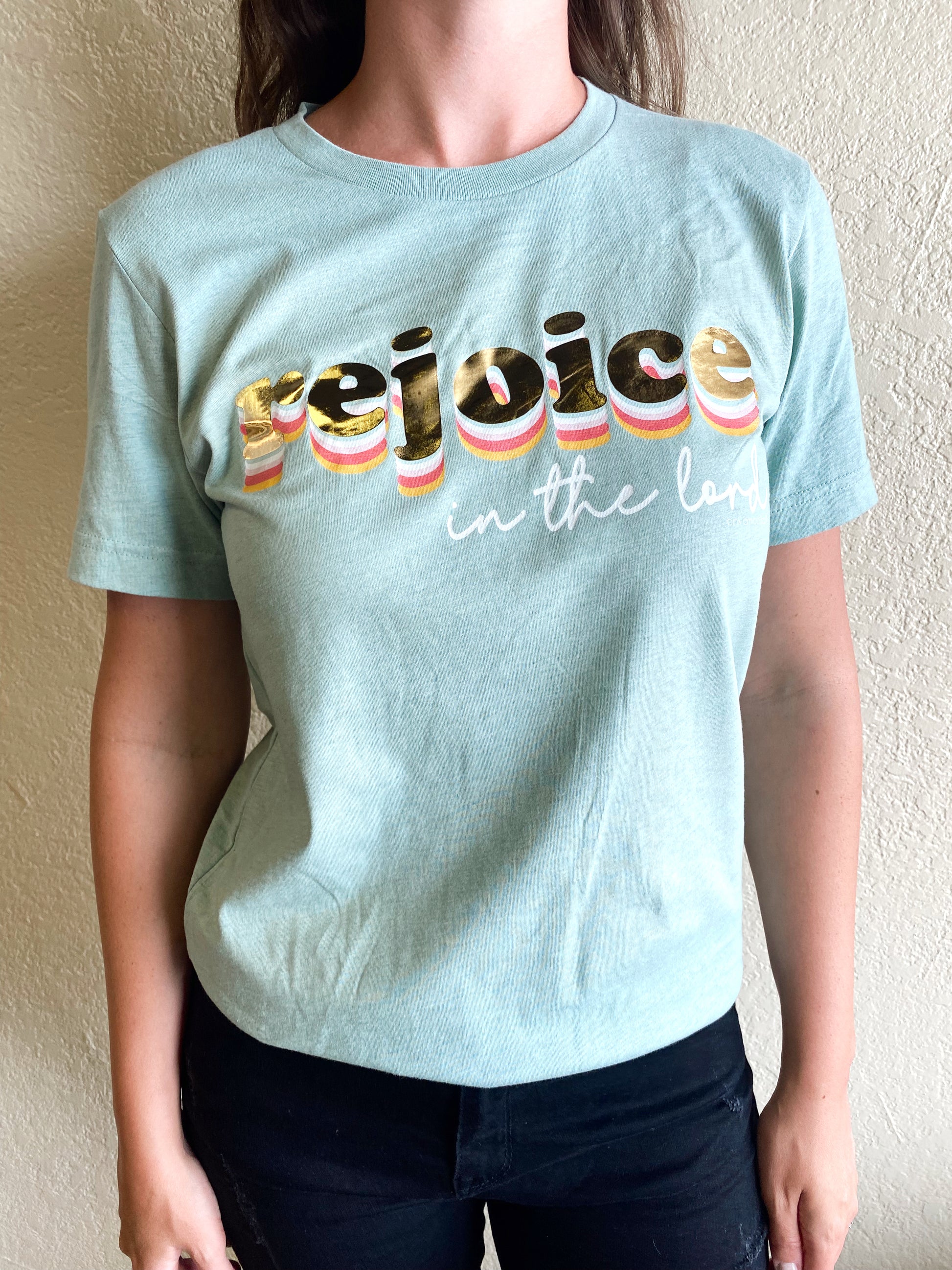 Spread joy with our Rejoice T-Shirt! The gold foil lettering adds a touch of elegance to the seafoam green color. With a flattering fit, this shirt will leave you feeling confident and happy.