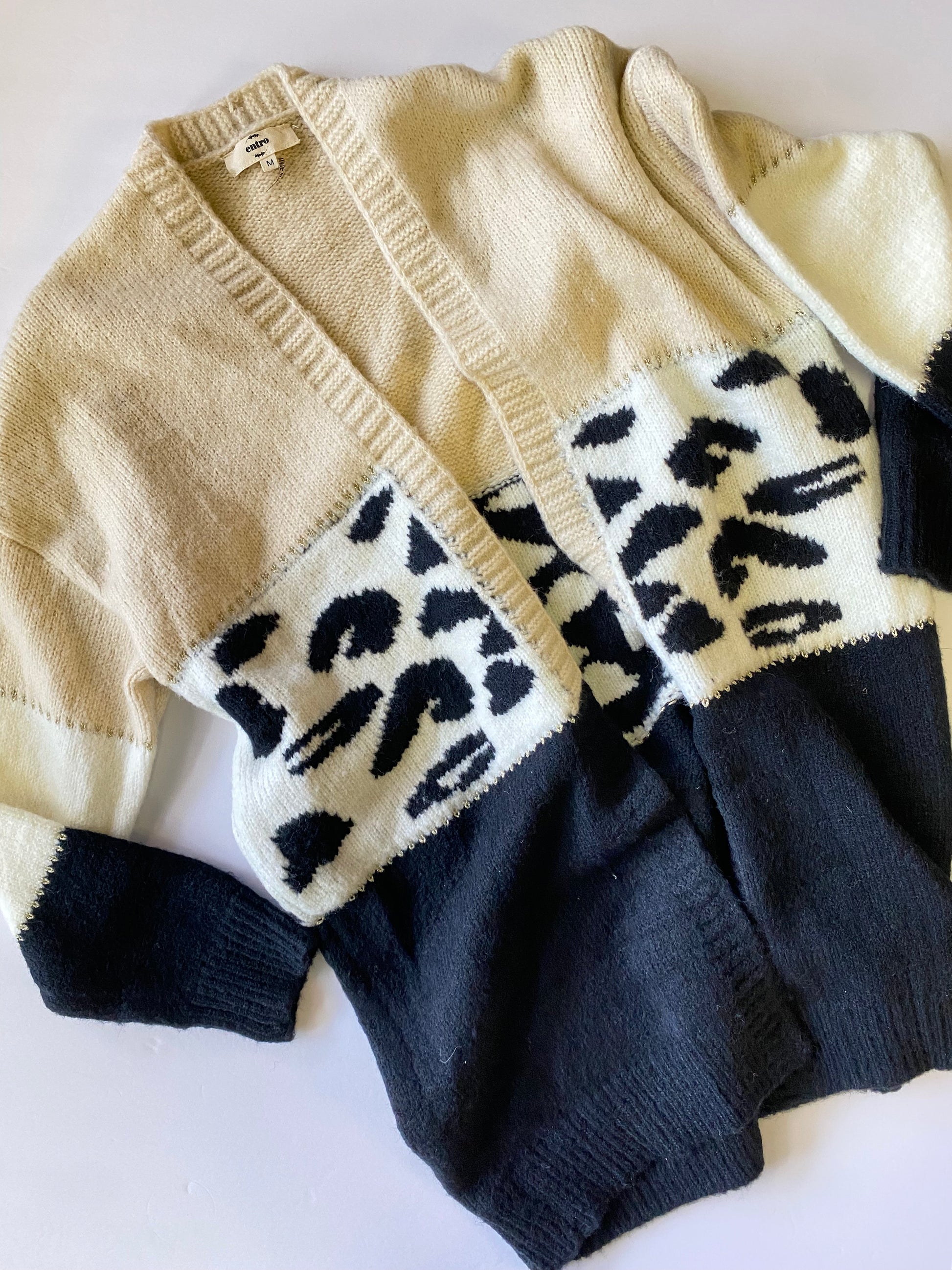 Introducing the "Seems So Easy" cardigan - a cozy and quirky addition to your wardrobe. With a playful colorblock design and bold cheetah print, this cardigan is the perfect mix of style and comfort. Made with thick, heavy material, it's sure to keep you warm on those chilly days.