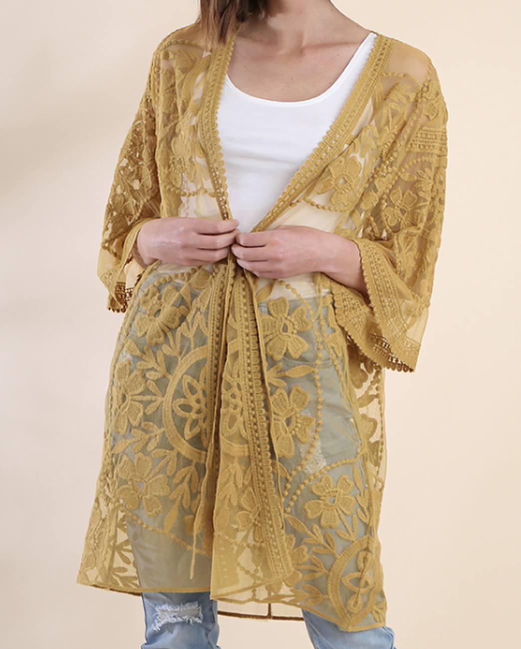 Our Stick Season Kimono is the perfect addition to your wardrobe! This plus size kimono features delicate lace and mesh details, adding a touch of elegance to any outfit. The tie front closure allows for a customizable fit, and the stunning mustard yellow color is sure to turn heads.