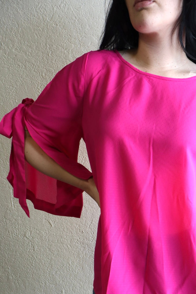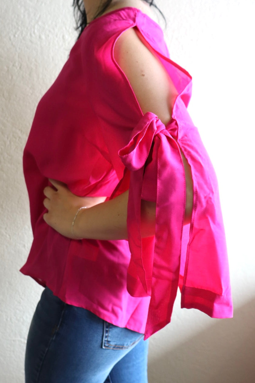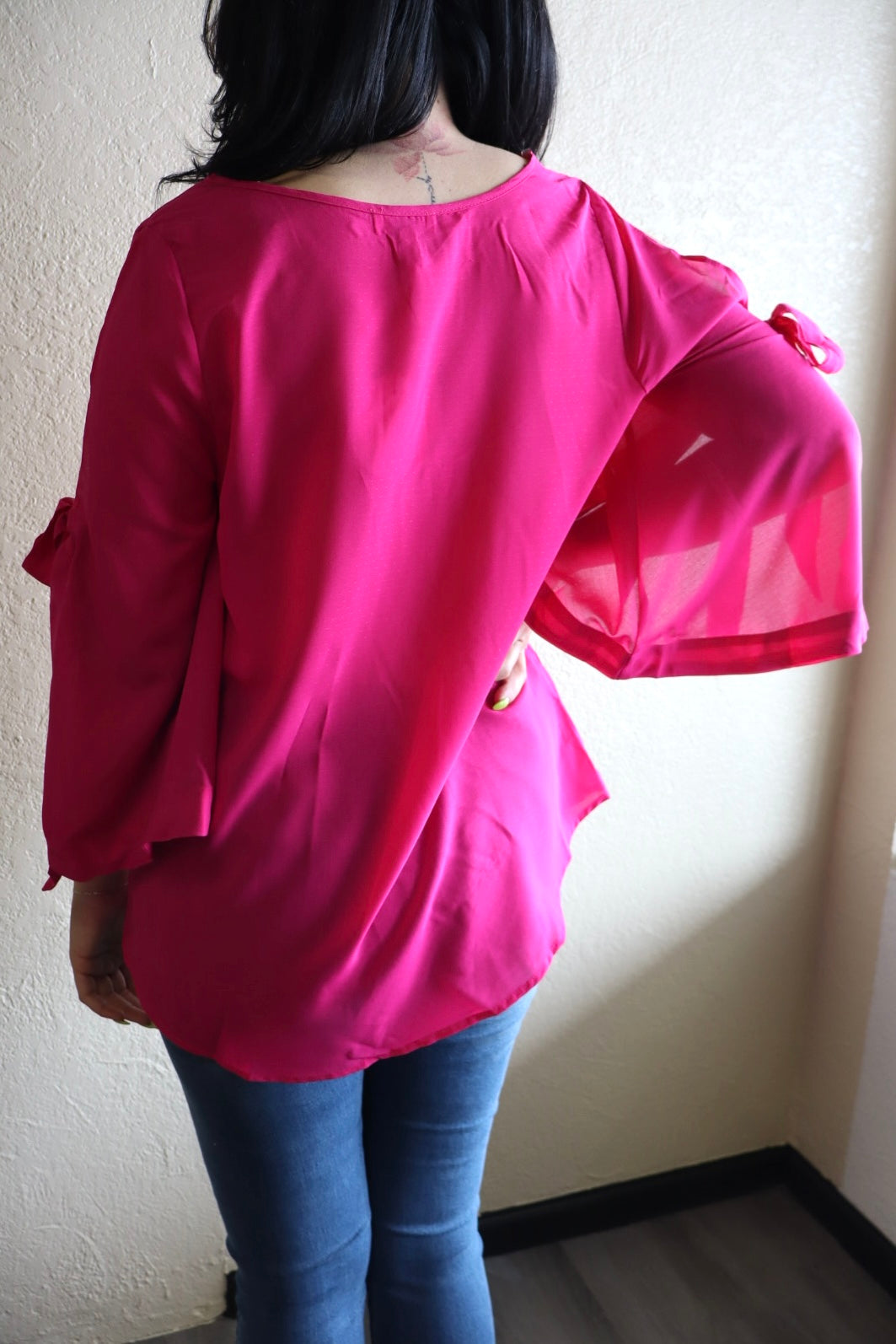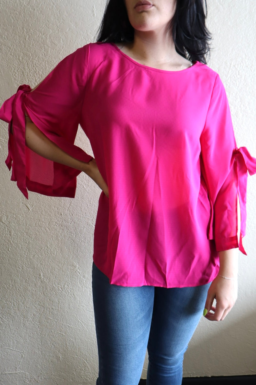 This hot pink top features a unique tie detail on the sleeves, adding a touch of elegance to any outfit. The open sleeves allow for easy movement and versatility to dress up any look.